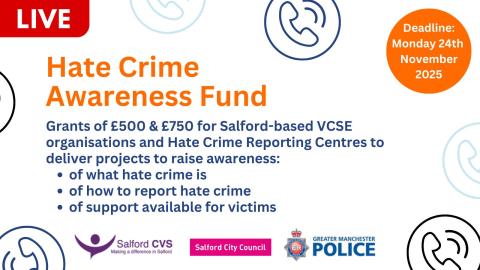 The Hate Crime Awareness Fund will be awarding grants of up to £500 to support organisations to deliver activities during Greater Manchester Hate Crime Awareness Week (2nd – 6th February 2026) OR up to £750 for activity throughout the month of February 2026. The aim of the fund is to increase people’s understanding of hate crime, how and why hate crime incidents should be reported through Hate Crime Reporting Centres/Ambassadors, and to promote the services available for victims of hate crime.