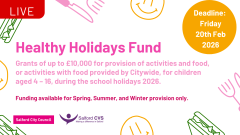 The Healthy Holidays Fund is open to voluntary, community and social enterprise (VCSE) sector organisations to provide food and activities for children in Salford during the spring (Easter), summer and winter (Christmas) school holidays.